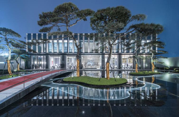 转屏风而入,仿佛进入了另一方天地,门内与门外恍如隔世,大面积运用静水面,并于水面上种植七棵具有傲骨气质的造型松树,中庭空间水景、松树、拱桥交相辉映,彰显东方气质。